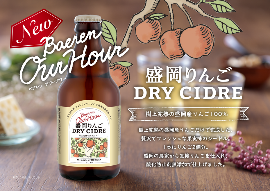 「べアレン Our Hour 盛岡りんごドライシードル」は、いわて果実の微発泡ワインシリーズ“Our Hour”より新発売する、地元・盛岡産りんごのみを使用したドライシードルです。